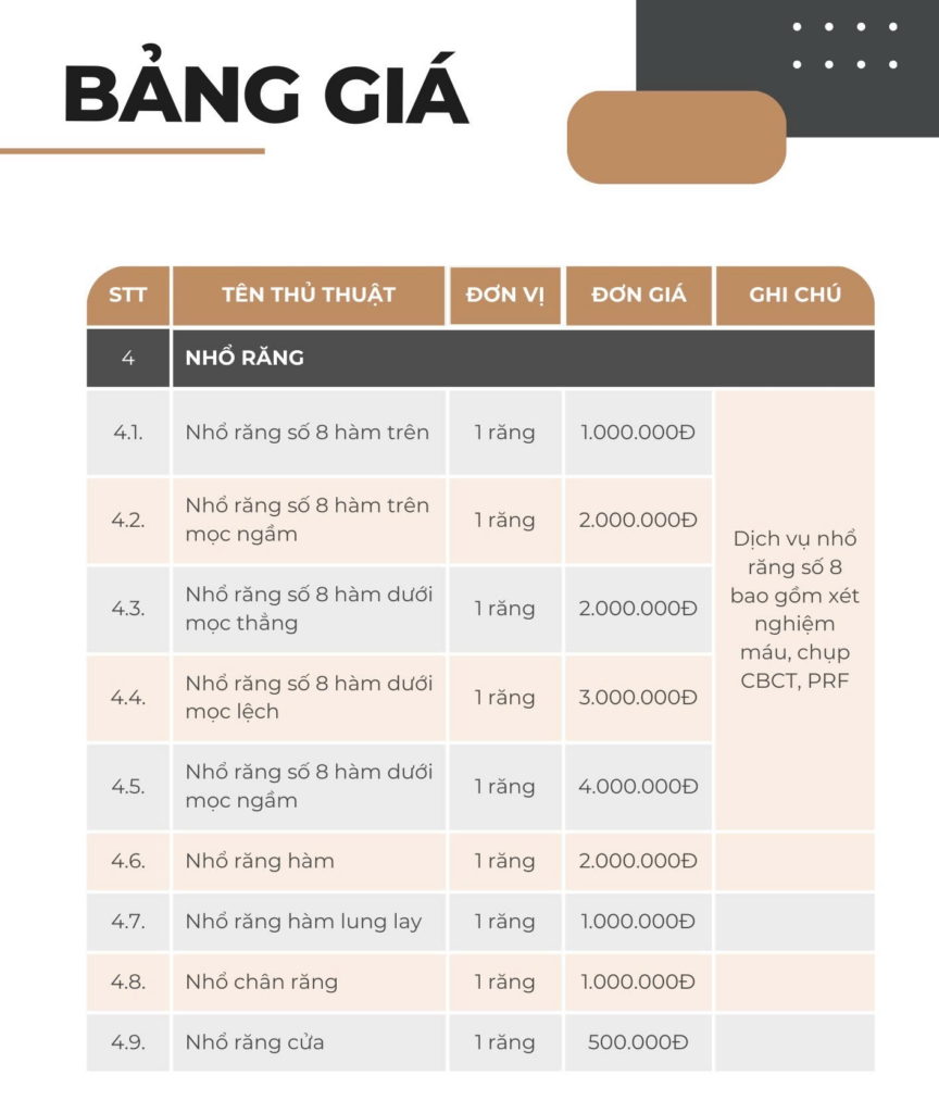 Sau đây là bảng phí nhổ răng khôn hàm dưới và hàm trên tại Nha khoa MIA Dental Clinic – một trong những cơ sở nha khoa uy tín, quy tụ đội ngũ bác sĩ giàu kinh nghiệm, giỏi chuyên môn: