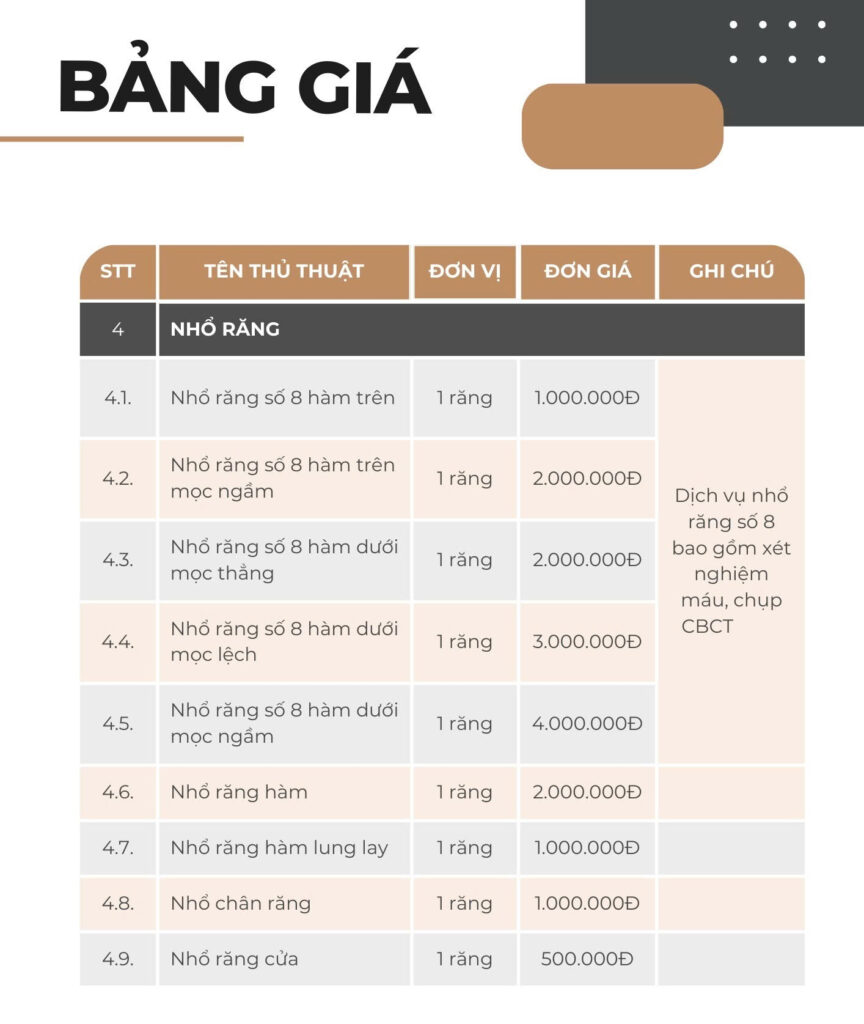 Sau đây là bảng phí nhổ răng khôn hàm dưới và hàm trên tại Nha khoa MIA Dental Clinic – một trong những cơ sở nha khoa uy tín, quy tụ đội ngũ bác sĩ giàu kinh nghiệm, giỏi chuyên môn: